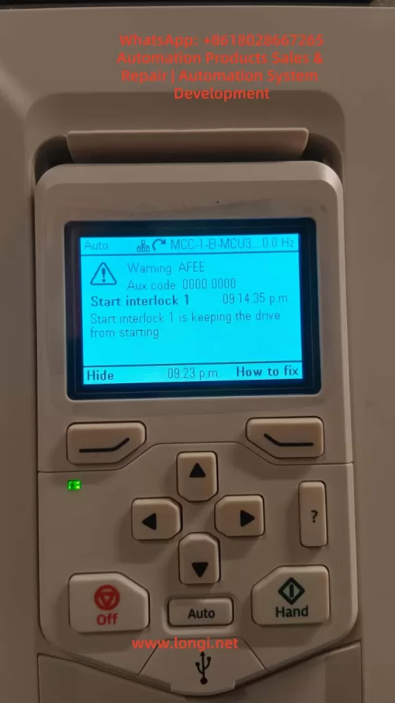 “Start Interlock 1” is an inherent safety protection logic in ABB ACH580 VFDs, designed to ensure that the drive starts the motor only when external conditions are met. Its core function is to monitor preset digital input signals (default DI4 terminal) or communication instruction states to determine whether the device is ready for startup. When the interlock signal is invalid, the VFD immediately blocks the startup process, displays a warning on the panel, and accompanies it with an AFEE code.