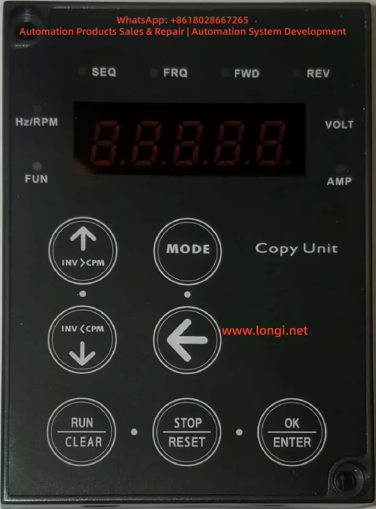 In terms of hardware, the JN5-CU uses an RS-485 communication interface to connect with the inverter. With built-in EEPROM memory, it can store up to 4 sets of parameter groups, each supporting PLC program storage. This makes it not just a copying tool but also a device for remote control and diagnostics. The buttons include INV>CPM (download), CPM>INV (upload), MODE (mode switching), RUN/STOP (operation control), and ENTER (confirmation), offering intuitive operation.