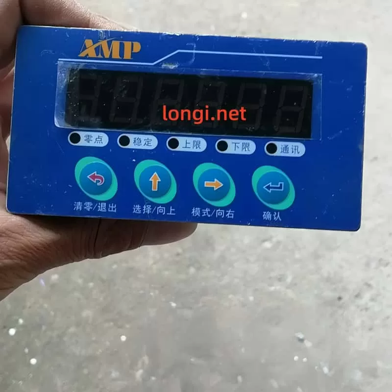 Original AMP digital weight display controller model EXT504-T-920B1. Features upper/lower limit alarms, communication port, and LED display. DC 24V powered, suitable for batching, hoppers, and industrial weighing systems.